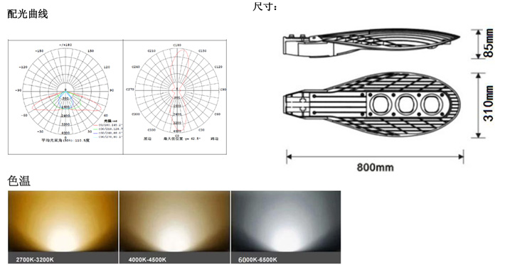 2.光學(xué)玻璃透鏡,可靠的二次光學(xué)設(shè)計及的角度定位,提高光照效果;有TYPEⅡ TYPEⅢ等多種配光方式,適用于二車道三車道四車道等多種路面;