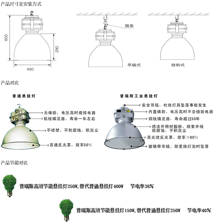 應(yīng)用場所: 工業(yè)廠房、體育場、候車大廳、機場、博物館、商場、市、店鋪、各種專賣店。 電器配置: 》鎮(zhèn)流器:通過CE,CCC認證的帶過熱保護鎮(zhèn)流器,防止光源壽命終結(jié)時產(chǎn)生的整流效應(yīng)而導(dǎo)致意外發(fā)生。 》觸發(fā)器:通過CE,CQC認證的三線串聯(lián)式TC105℃觸發(fā)器。 》電容器:通過CE,CQC,UL認證TCTC105℃的防爆自愈式鋁殼電容器。 可選用智能觸發(fā)器,具有自動檢測和延時關(guān)閉功能,能有效延長光源和電器的壽命,降低維護成本及避免維護時產(chǎn)生電氣安全隱患。 直接吊裝安裝、吊裝安裝、主電源線經(jīng)安裝系統(tǒng)走線。 產(chǎn)品參數(shù)信息: